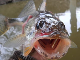I'm drawn like a magnet to seams. Places where fast water meets slower water. Or the seam of a strong eddy right where the water running downstream rubs against the water coming back upstream in the eddy. I think these kinds of places were made for bigger smallmouth bass. It's my theory that a bigger bass has a distinct advantage over it's prey, and smaller bass for that matter, in this situation. You see a fish's lateral line is kinda like an antennae. And the bigger the antennae the better the reception. So in the jumbled up water of a fast seam a big bass is able to pick up an approaching baitfish with his 18 inch long lateral line when the 1 or 2 inch long lateral line of the bait simply cannot pick out the bass at all in the maelstrom of conflicting currents. I don't think we can emphasize enough the importance of a fish's lateral line. I once saw a study done on pike in clear water. In clear water pike that had been blinded hit a lure with better accuracy than pike that could see the bait perfectly well but had damaged lateral lines! Anyway whether or not my theory holds water I do know that I catch an awful lot of big smallmouth bass on seams. Show me a seam below a riffle in a creek, below a lowhead dam in a river or below concrete rubble in a big river like the Ohio and those are the places I'll fish the longest and put the most effort into. I think many really strong and conflicting seams may not hold a lot of small bass because they do not have the length of lateral line to take full advantage of the situation like a big bass does. But they often hold the biggest fish in any given stretch of water.